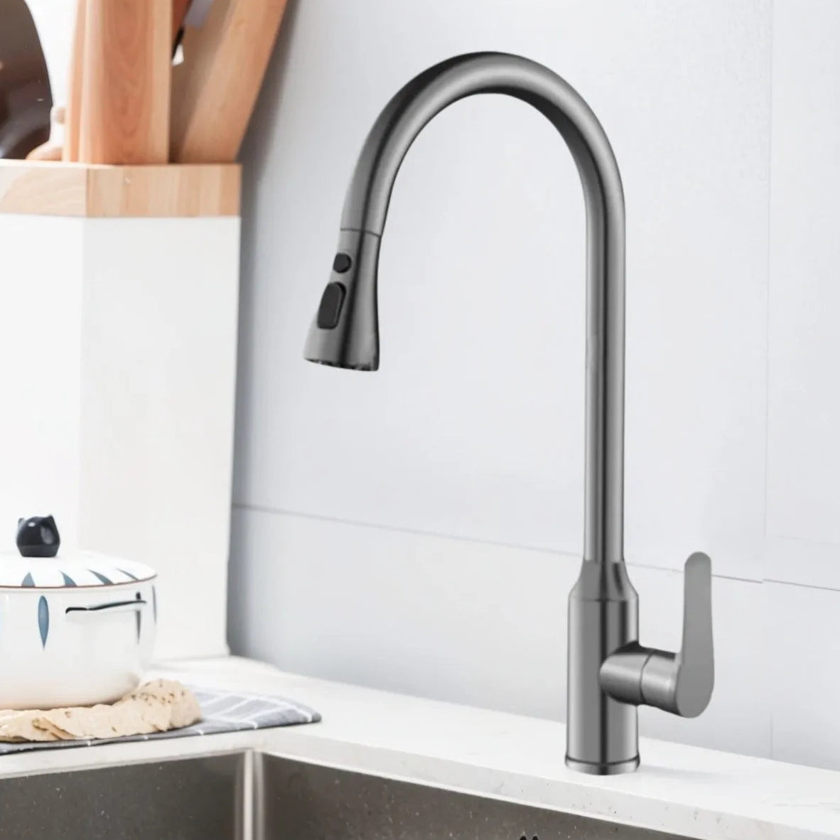 Torneira de cozinha moderna, 360 ° parada giratória de um toque + modos de pulverização duplos, aço inoxidável 304, acabamento escovado.